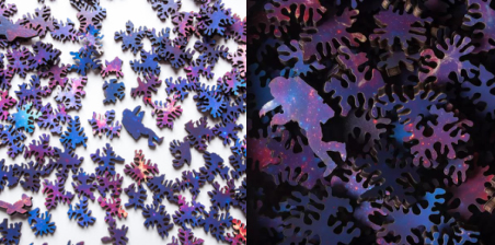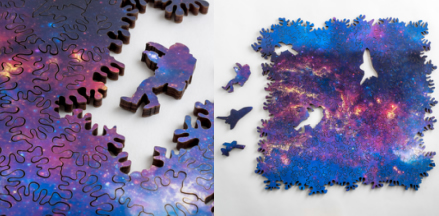 整套拼圖只有133塊,但我們可以從任意一塊出發開始構建群星閃爍的銀河系。激光切割工藝屬于非接觸性的加工,不存在工具的磨損,制成每一小塊之間的聯系隨機,圖像隨著拼湊延伸不斷變化,就如同身臨其境地探索星系。